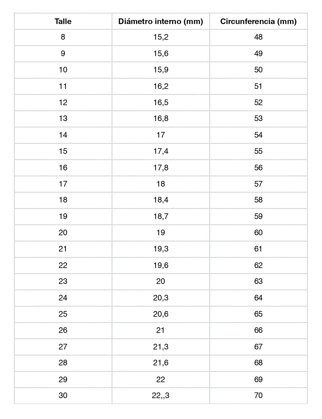 Medí (en mm) el diámetro interno de un anillo que te quede cómodo o la circunferencia del dedo donde vayas a querer tu anillo. Compará el equivalente aproximado en la tabla: